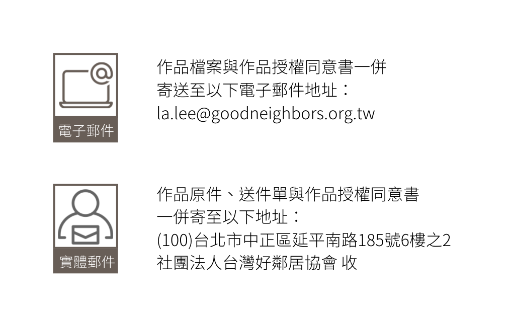 與作品檔案一併寄送至以下電子郵件地址:la.lee@goodneighbors.org.tw